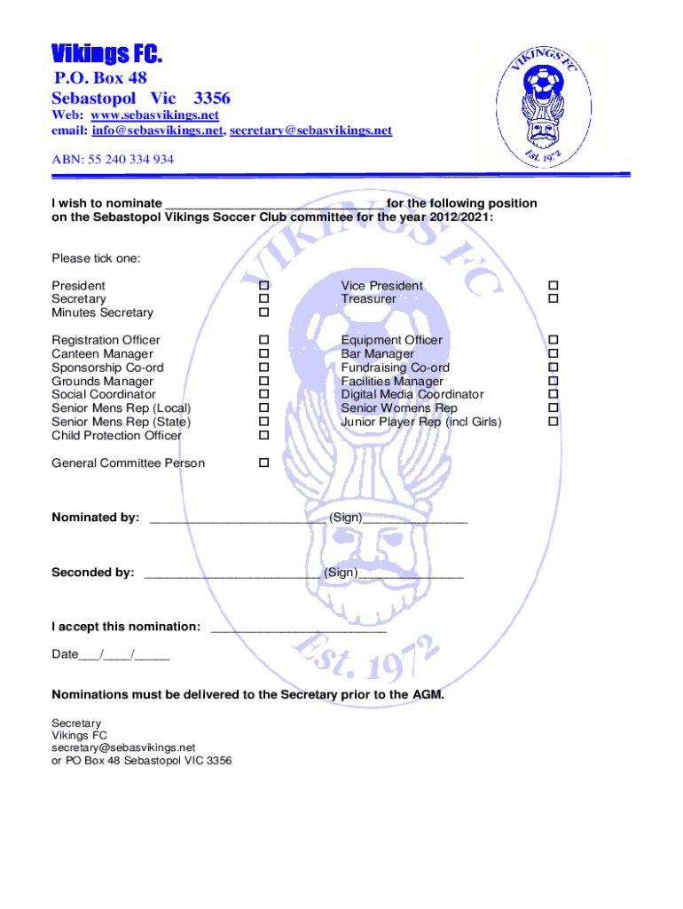 Vikings FC. P.O. Box 48 Sevastopol Vic 3356 Web: www.sebasvikings.net email: info sebasvikings.net, secretary sebasvikings.net ABN: 55 240 334 934I wish to nominate for the following position on the