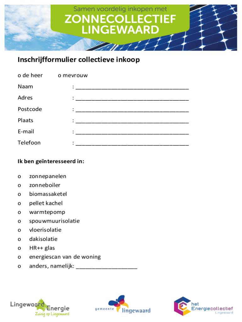 Inschrijfformulier collective indoor DE hero mevrouwNaam: Acres: Postcode: Plants: Email: Telephone: In Ben genteresseerd in:ozonnepanelenozonneboilerobiomassaketelopellet kachelowarmtepompospouwmuurisolatieovloerisolatieodakisolatieoHR++