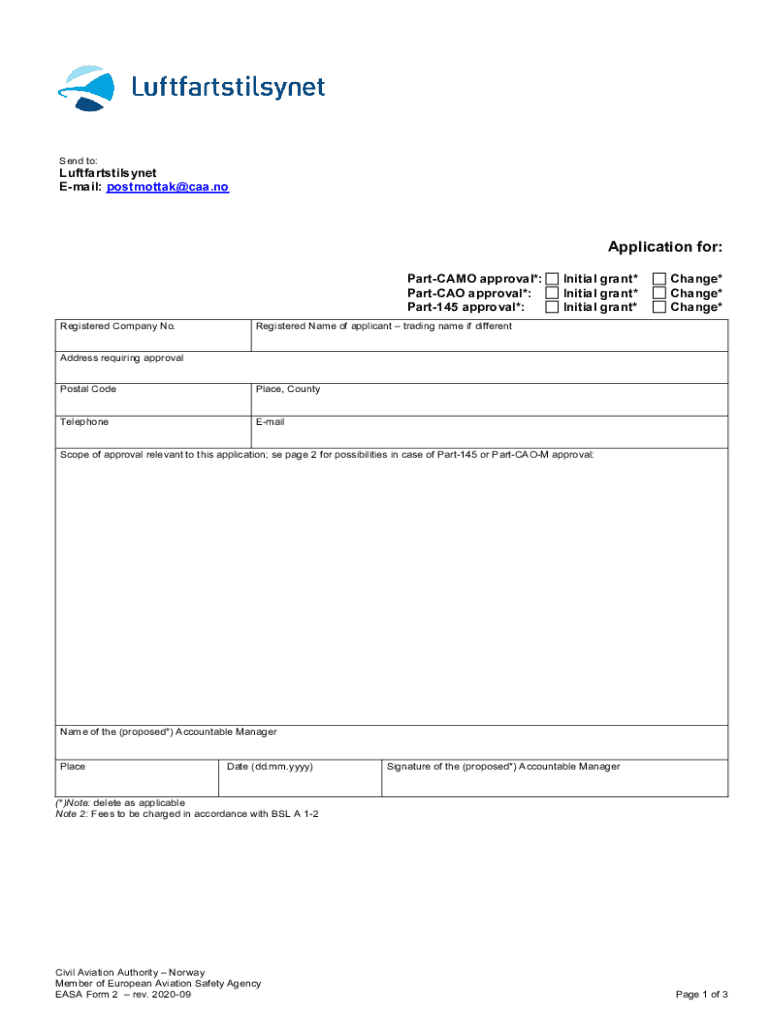 Send to:Luftfartstilsynet Email: postmortem CAA.application for: Partial approval*: Partial approval*: Part145 approval*: Registered Company No. Initial grant* Initial grant* Initial grant×Change*
