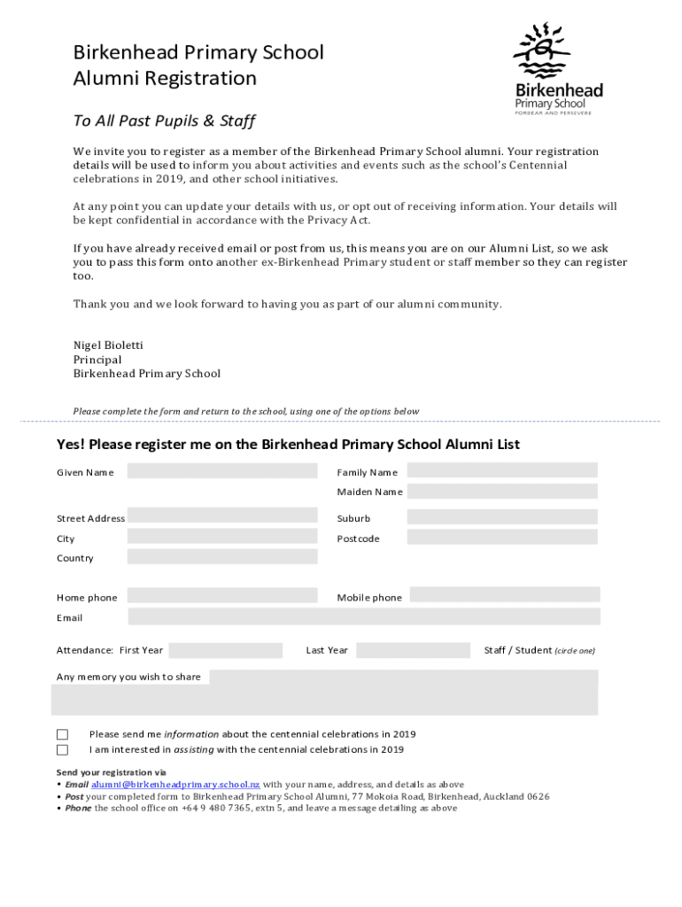 BirkenheadPrimarySchool AlumniRegistrationToAllPastPupils&StaffWeinviteyoutoregisterasamemberoftheBirkenheadPrimarySchoolalumni. Your registration detailswillbeusedtoinformyouaboutactivitiesandeventssuchastheschool