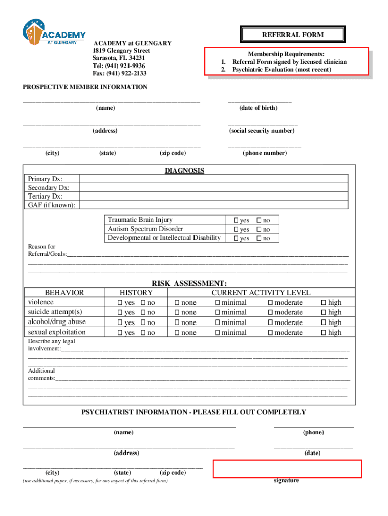 REFERRAL FORM ACADEMY at GLENGARRY 1819 Glengarry Street Sarasota, FL 34231 Tel: (941) 9219936 Fax: (941) 9222133FORM 1. 2. Membership Requirements: Referral Form signed by licensed clinician Psychiatric