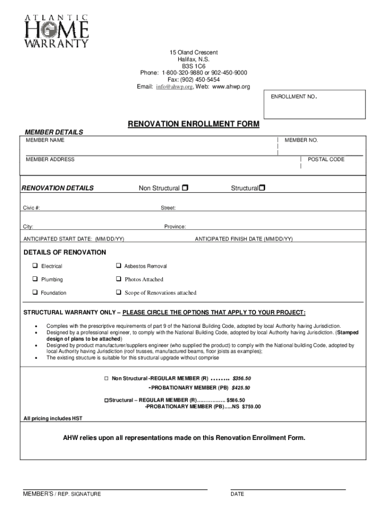 15 Öland Crescent Halifax, N.S. B3S 1C6 Phone: 18003209880 or 9024509000 Fax: (902) 4505454 Email: info AHIP.org, Web: www.ahwp.org ENROLLMENT NO.RENOVATION ENROLLMENT FORM MEMBER DETAILS MEMBER