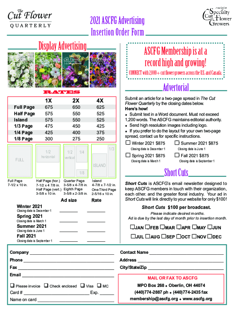 Theft Flower2021 AS CFG Advertising Insertion Order FormQUARTERLYDisplay AdvertisingASCFG Membership is at a record high and growing! CONNECT with 2,000+ cut flower growers across the U.S. and Canada.
