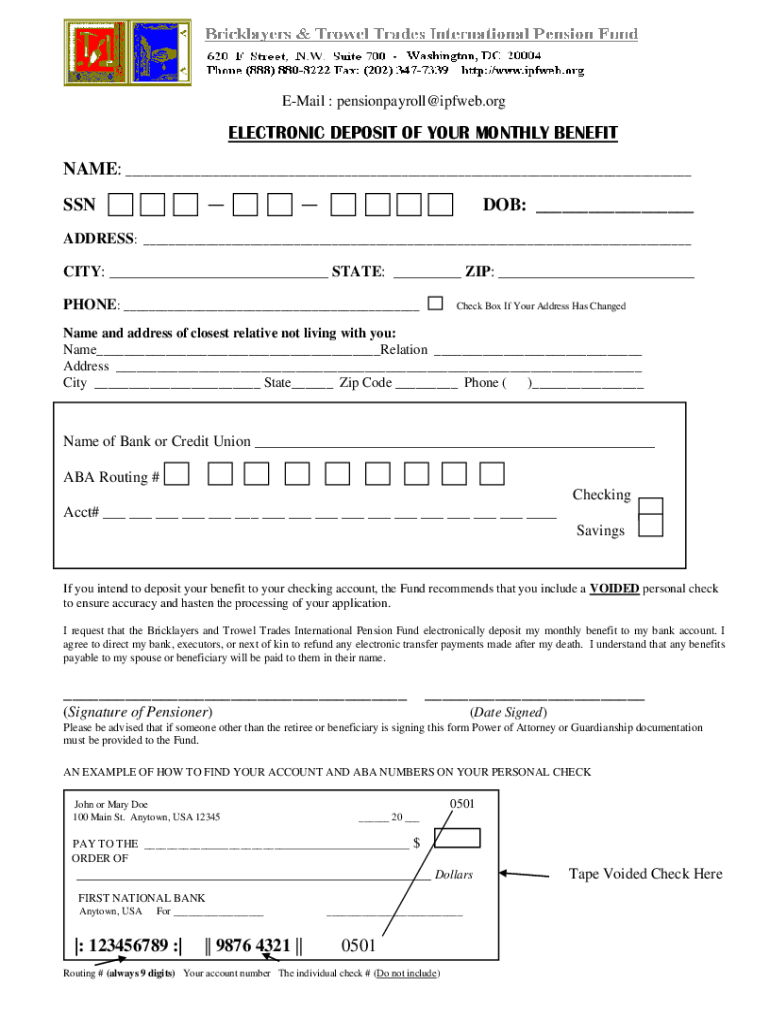 Email : pension payroll power. Electronic DEPOSIT OF YOUR MONTHLY BENEFIT NAME: SNOB: ADDRESS: CITY: STATE: ZIP: PHONE: Check Box If Your Address Has ChangedName and address of the closest relative