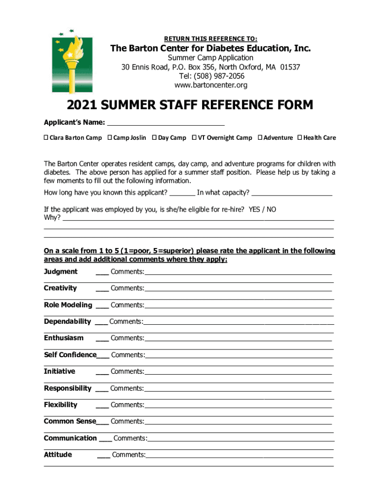 RETURN THIS REFERENCE TO:The Barton Center for Diabetes Education, Inc. Summer Camp Application 30 Tennis Road, P.O. Box 356, North Oxford, MA 01537 Tel: (508) 9872056 www.bartoncenter.org2021 SUMMER
