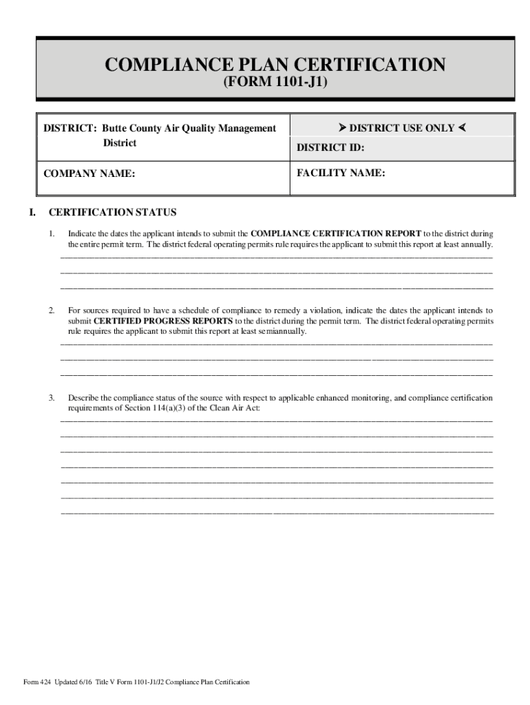 COMPLIANCE PLAN CERTIFICATION (FORM 1101J1)I. DISTRICT USE ONLY DISTRICT: Butte County Air Quality Management DistrictDISTRICT ID:COMPANY NAME:FACILITY NAME:CERTIFICATION STATUS 1. Indicate the dates
