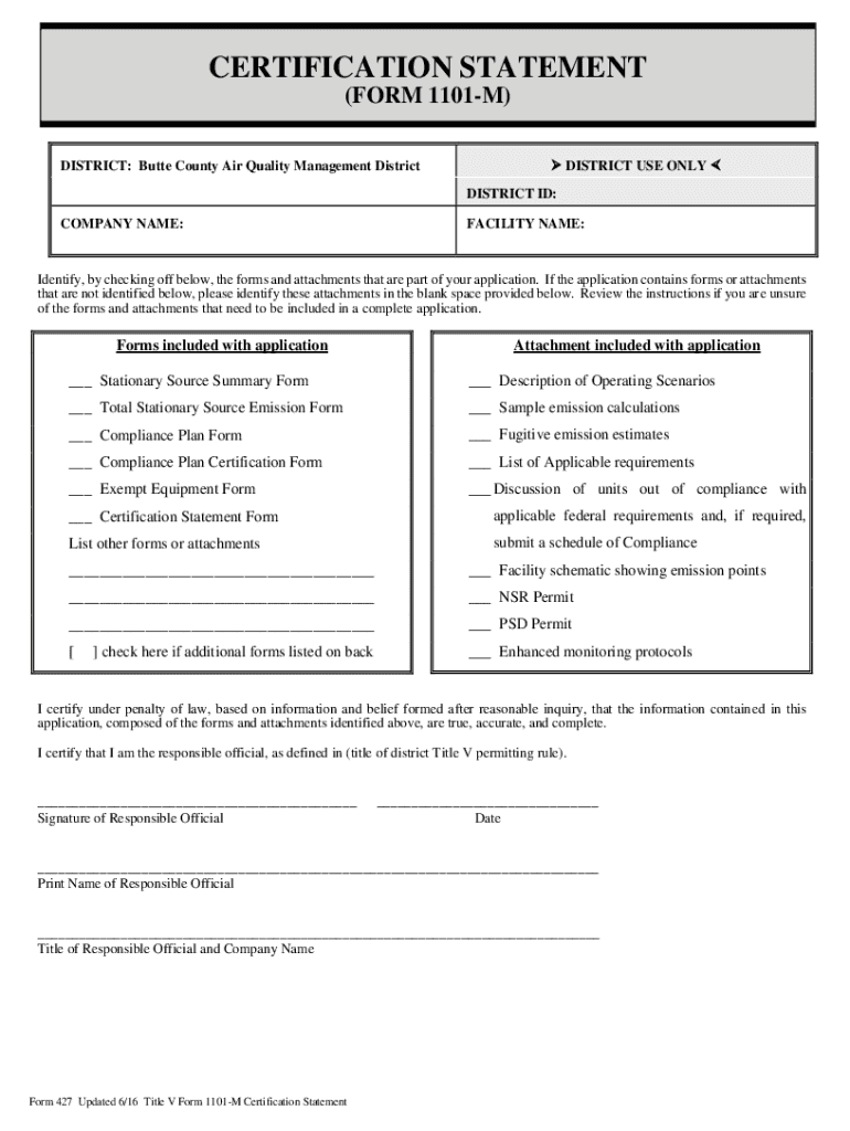 CERTIFICATION STATEMENT (FORM 1101M) DISTRICT: Butte County Air Quality Management District USE ONLY DISTRICT ID:COMPANY NAME:FACILITY NAME:Identify, by checking off below, the forms and attachments