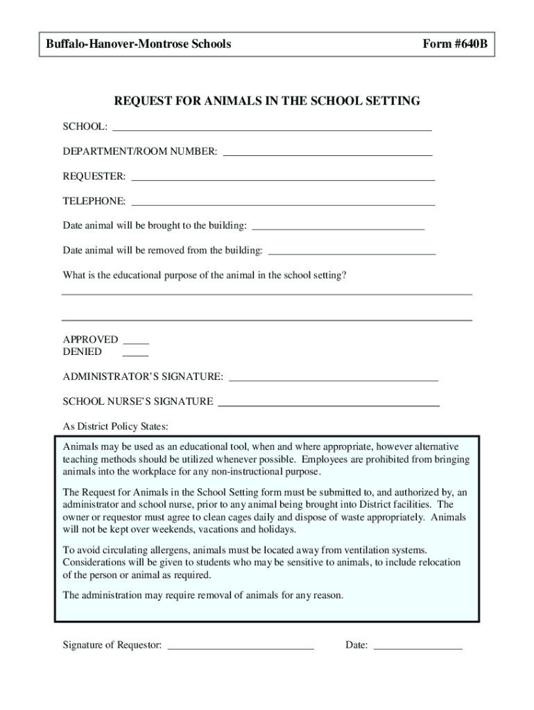 BuffaloHanoverMontrose Schoolwork #640BREQUEST FOR ANIMALS IN THE SCHOOL SETTING SCHOOL: DEPARTMENT/ROOM NUMBER: REQUESTER: TELEPHONE: Date animal will be brought to the building: Date animal will