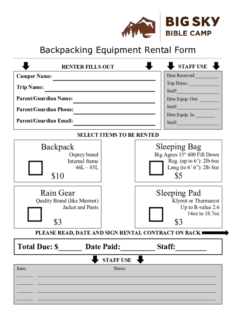 Get the free Backpacking Equipment Rental Form - Big Sky Bible Camp