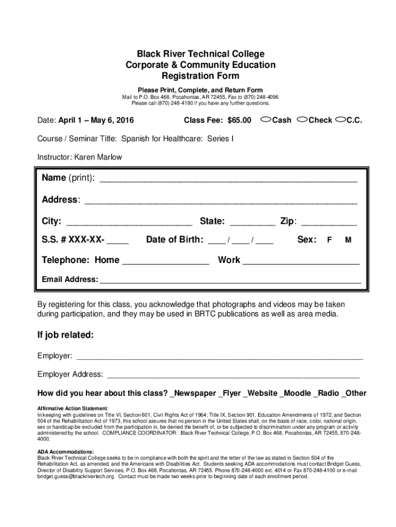 Black River Technical College Corporate & Community Education Registration Form Please Print, Complete, and Return Form Mails to P.O. Box 468, Pocahontas, AR 72455, Fax to (870) 2484096 Please call