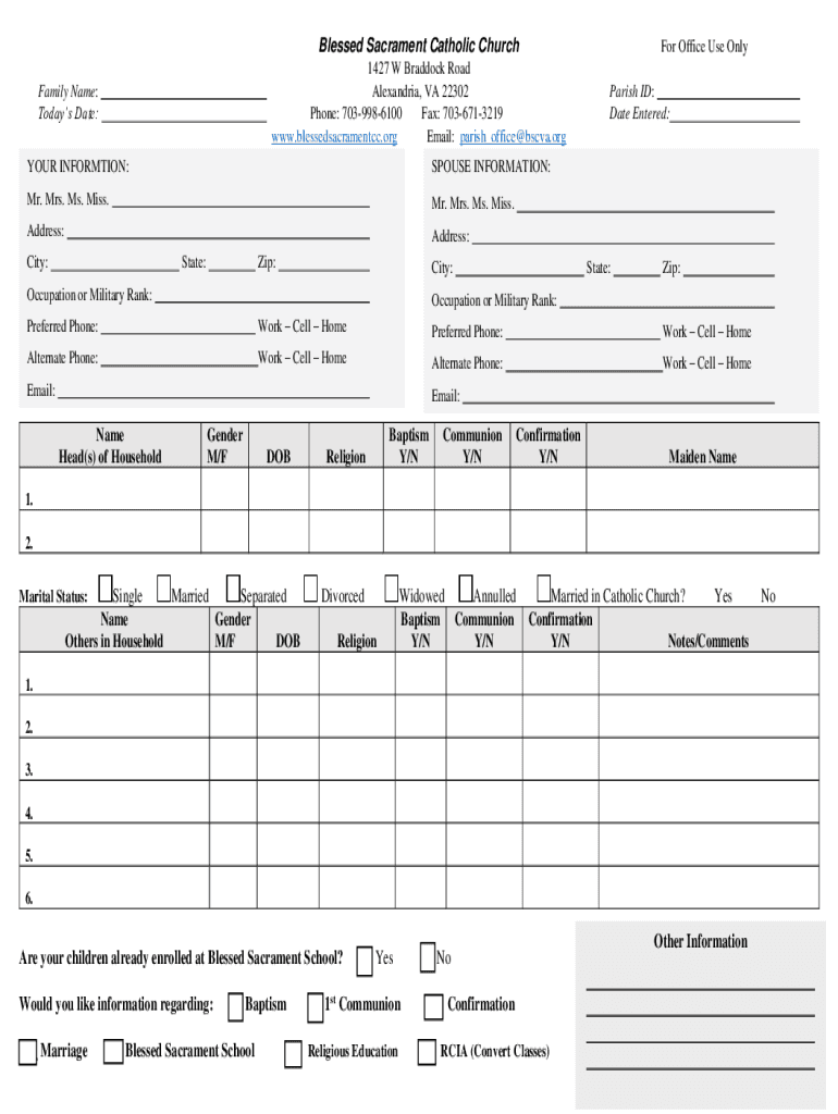 Blessed Sacrament Catholic Churchgoer Office Use Only1427 W Braddock Road Alexandria, VA 22302 Phone: 7039986100 Fax: 7036713219 www.blessedsacramentcc.org Email: parish office BSA.family Name: Today's
