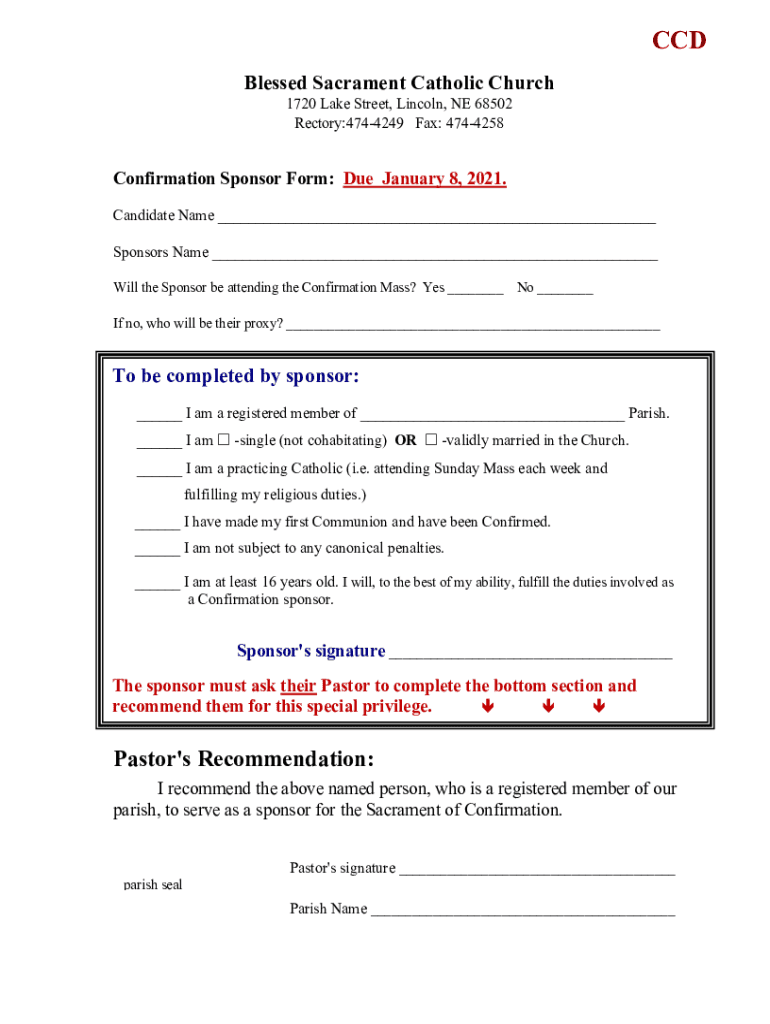 CCD Blessed Sacrament Catholic Church 1720 Lake Street, Lincoln, NE 68502 Rectory:4744249 Fax: 4744258Confirmation Sponsor Form: Due January 8, 2021. Candidate Name Sponsors Name Will the Sponsor
