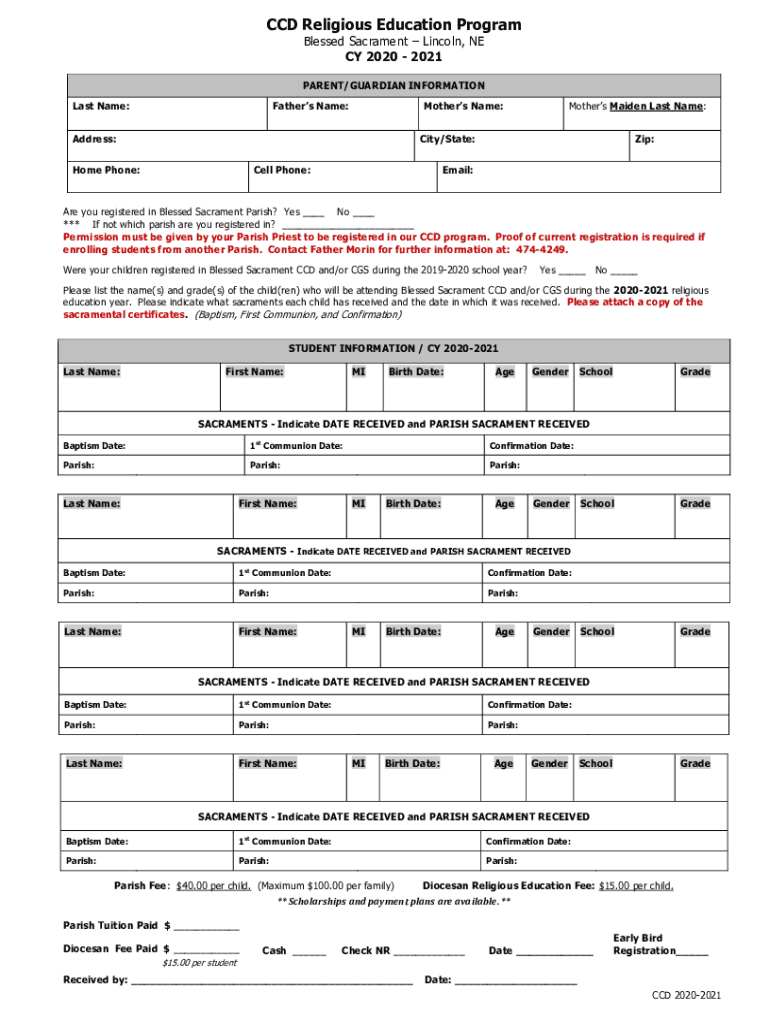 CCD Religious Education Program Blessed Sacrament Lincoln, NE CY 2020 2021 PARENT/GUARDIAN INFORMATION Last Name:Fathers Name:Mothers Name:Address:Mothers Maiden Last Name:City/State:Home Phone:Cell