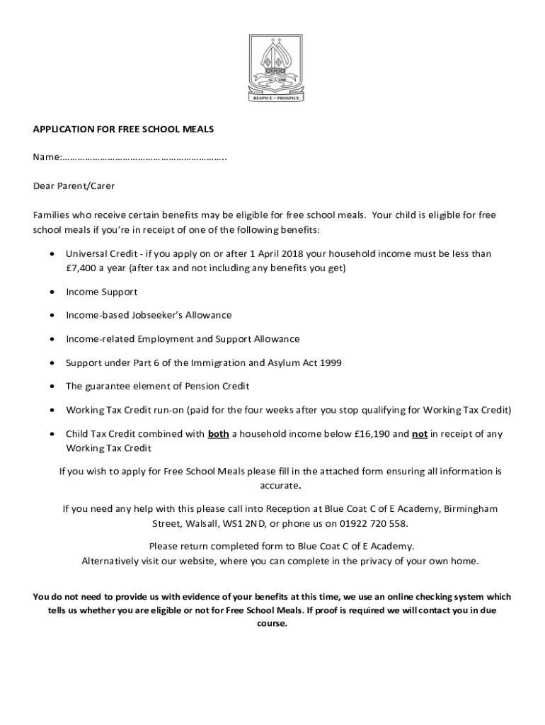 APPLICATION FOR FREE SCHOOL MEALS Name:. Dear Parent/Carer Families who receive certain benefits may be eligible for free school meals. Your child is eligible for free school meals if you're in receipt