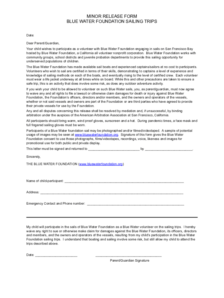 Your child wishes to participate as a volunteer with Blue Water Foundation engaging in sails on San Francisco Bay