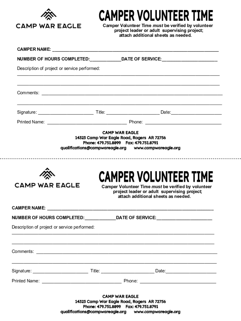 Camper Volunteer Time must be verified by volunteer project leader or adult supervising project; attach additional sheets as needed. CAMPER NAME: NUMBER OF HOURS COMPLETED: DATE OF SERVICE: Description