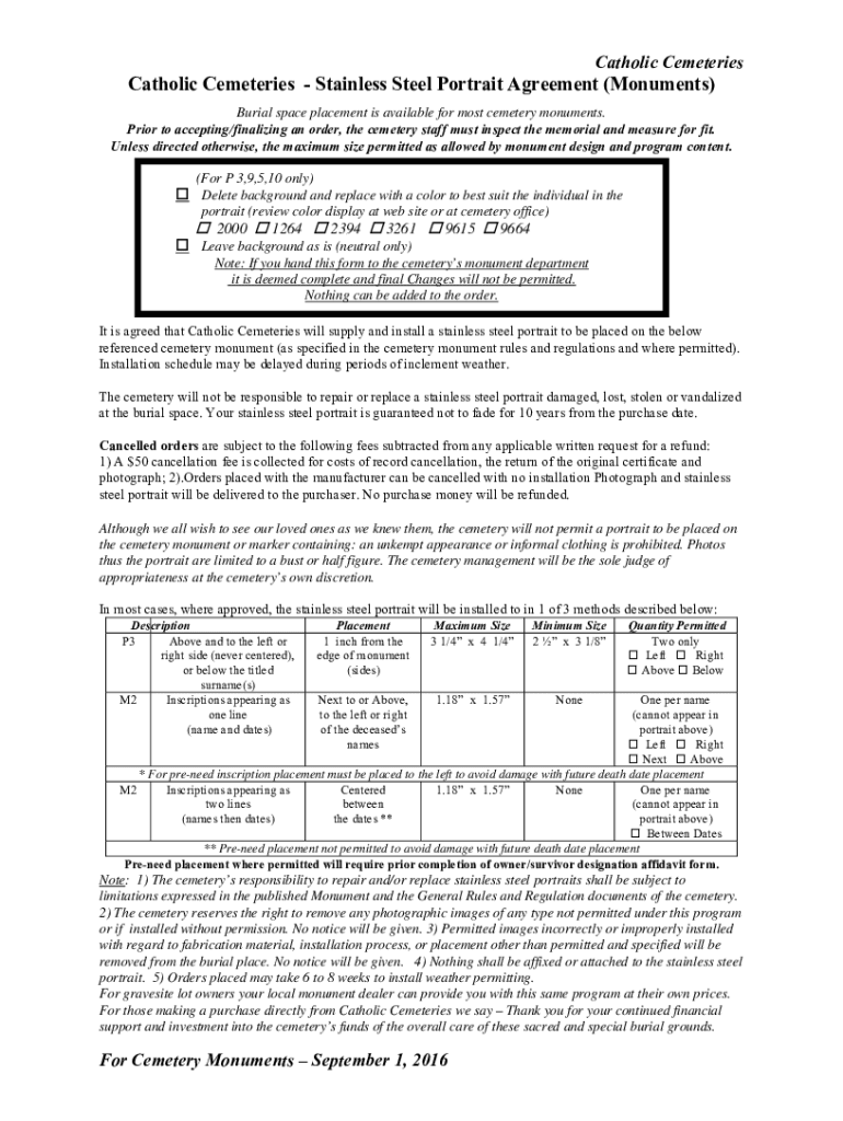 Catholic Cemeteries Stainless Steel Portrait Agreement (Monuments)Burial space placement is available for most cemetery monuments. Prior to accepting/finalizing an order, the cemetery staff must inspect