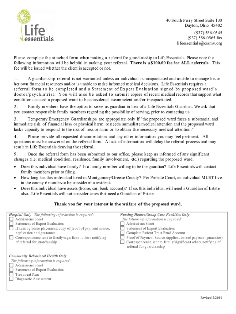 Please complete the attached form when making a referral for guardianship to Life Essentials.