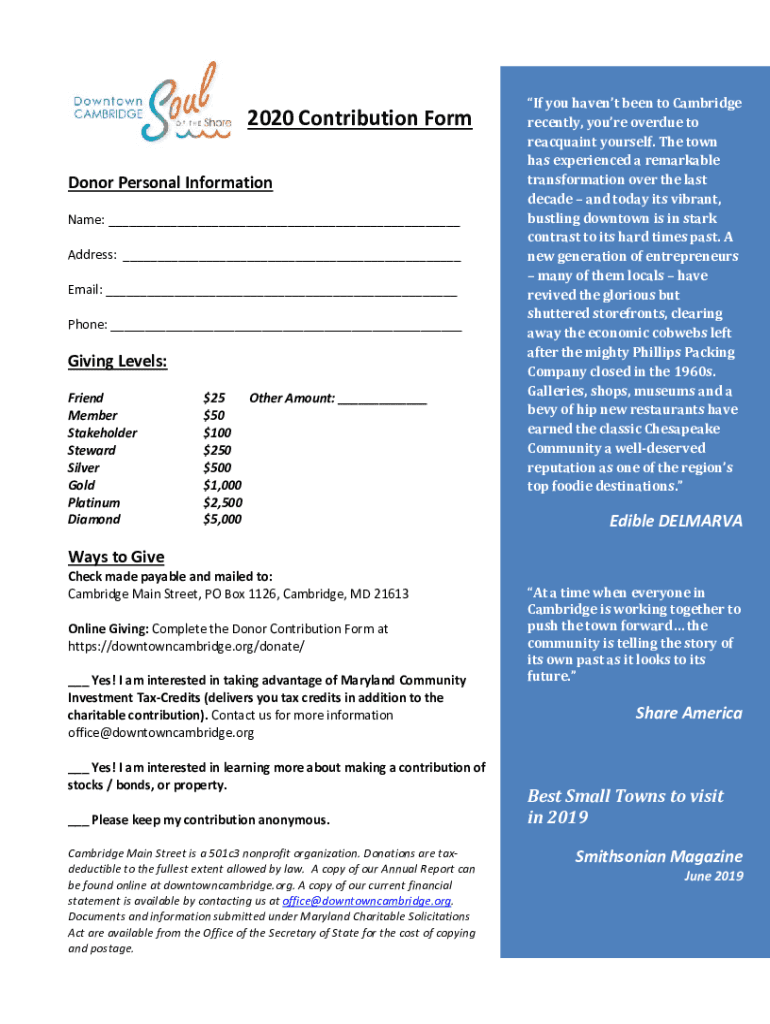 2020ContributionForm DonorPersonalInformation Name: Address: Email: Phone: GivingLevels: Friend Member Stakeholder Steward Silver Gold Platinum Diamond $25 OtherAmount: $$$$$$$501002505001,0002,5005,000WaystoGive