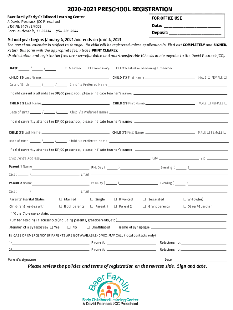 20202021 PRESCHOOL REGISTRATIONBaer Family Early Childhood Learning Center A David Po snack JCC Preschool 5151 NE 14th Terrace Fort Lauderdale, FL 33334 9543515544FOR OFFICE USE Date: Deposit: School
