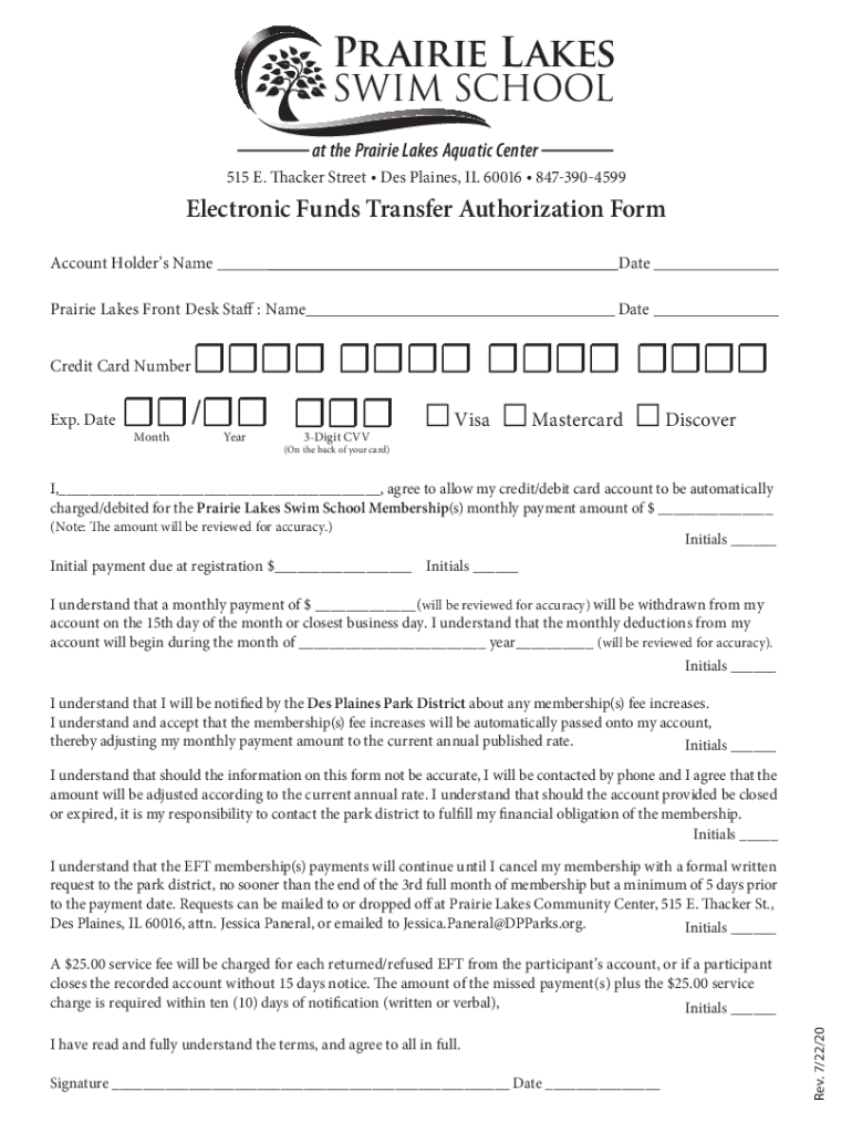 Prairie Lakes SWIM SCHOOL at the Prairie Lakes Aquatic Center 515 E. Thicker Street Des Plaines, IL 60016 8473904599Electronic Funds Transfer Authorization Form Account Holders Name Date Prairie Lakes