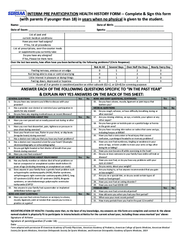 Get the free SDHSAA INTERIM PRE PARTICIPATION HEALTH HISTORY FORM ...