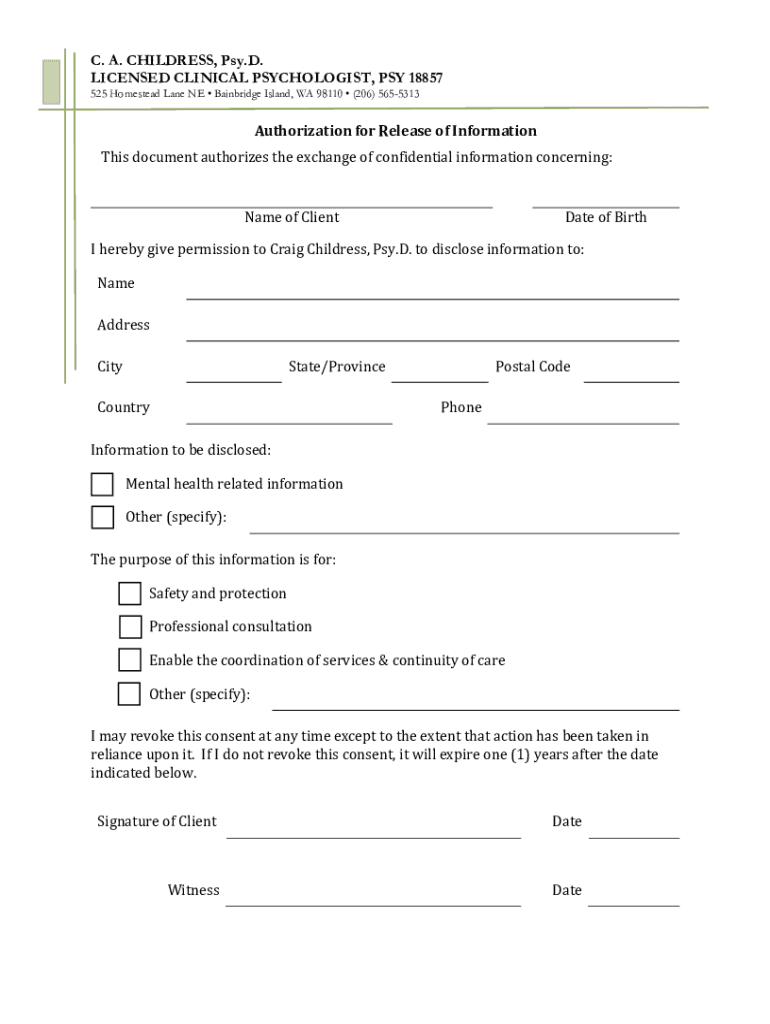 C. A. CHILDLESS, Pay. D. LICENSED CLINICAL PSYCHOLOGIST, PAY 18857 525 Homestead Lane NE Bainbridge Island, WA 98110 (206) 5655313Authorization for Release of InformationThis document authorizes the
