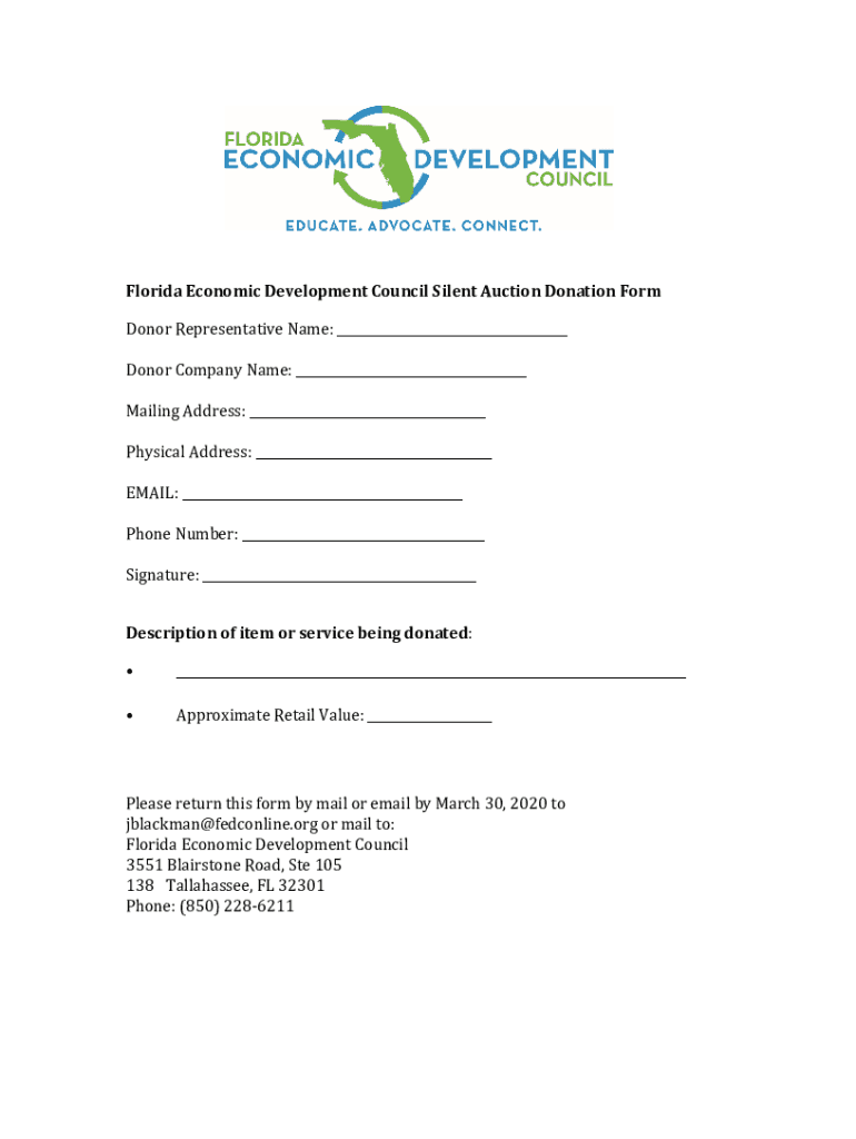 Florida Economic Development Council Silent Auction Donation Form Donor Representative Name: Donor Company Name: Mailing Address: Physical Address: EMAIL: Phone Number: Signature: Description of item