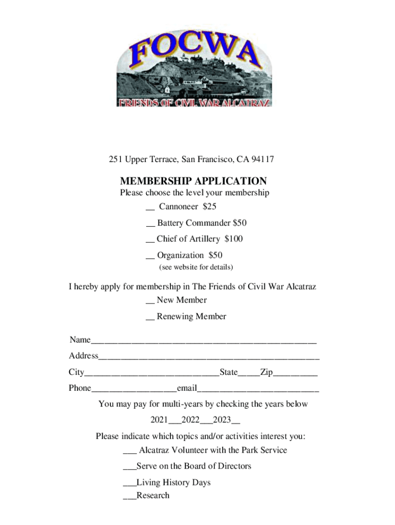 251 Upper Terrace, San Francisco, CA 94117MEMBERSHIP APPLICATION Please choose the level your membership Cannoneer $25 Battery Commander $50 Chief of Artillery $100 Organization $50 (see website for