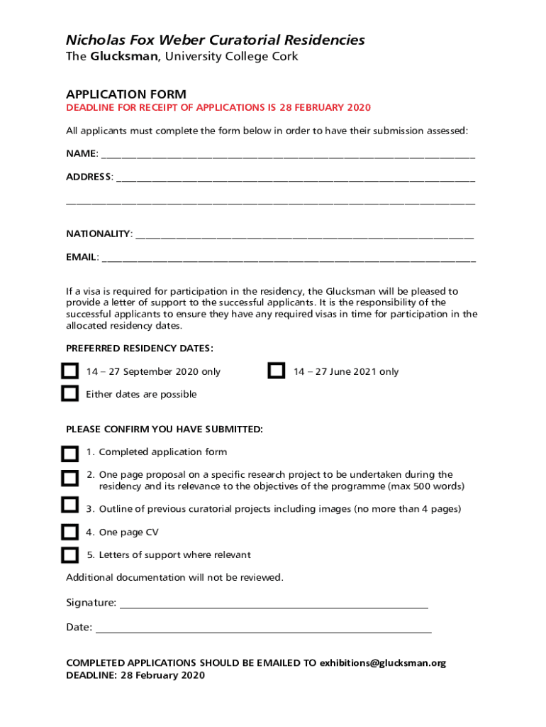Nicholas Fox Weber Curatorial Residencies The Glickman, University College Cork APPLICATION FORM DEADLINE FOR RECEIPT OF APPLICATIONS IS 28 FEBRUARY 2020 All applicants must complete the form below
