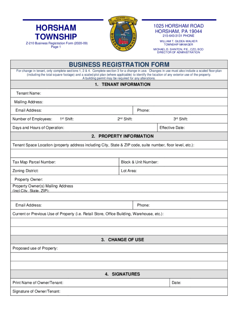 1025 FORDHAM ROAD FORDHAM, PA 19044HORSHAM TOWNSHIP2156433131 PHONE WILLIAM T. GILDEAWALKER TOWNSHIP MANAGERZ210 Business Registration Form (202009) Page 1MICHAEL D. SHINTO, P.E., CZO, BCO DIRECTOR