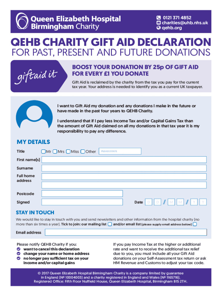 0121 371 4852 charities hub.NHS.UK web. Orgies CHARITY GIFT AID DECLARATION FOR PAST, PRESENT AND FUTURE DONATIONS BOOST YOUR DONATION BY 25p OF GIFT AID FOR EVERY 1 YOU DONATE Gift Aid is reclaimed