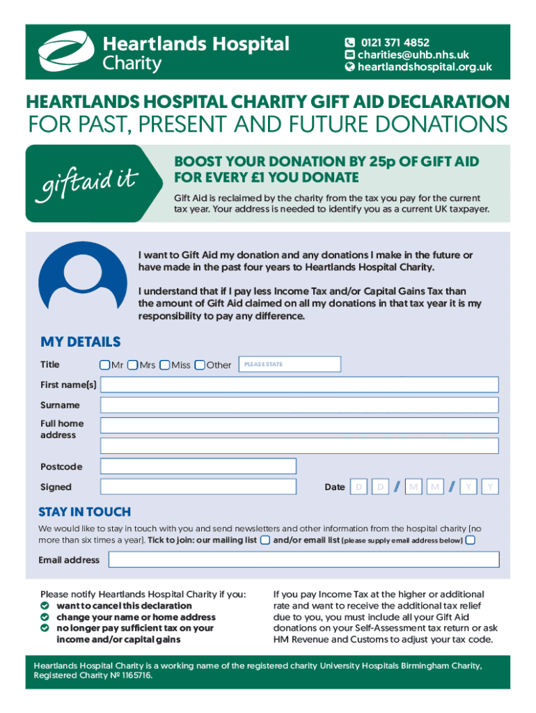 0121 371 4852 charities hub.NHS.UK heartlands hospital.org.heartlands HOSPITAL CHARITY GIFT AID DECLARATION PAST, PRESENT AND FUTURE DONATIONS BOOST YOUR DONATION BY 25p OF GIFT AID FOR EVERY 1 YOU