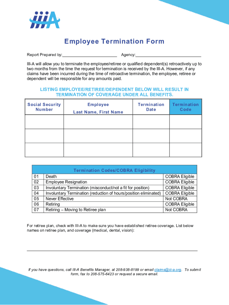 Employee Termination Form Report Prepared by: Agency: ILIA will allow you to terminate the employee/retiree or qualified dependent(s) retroactively up to two months from the time the request for termination
