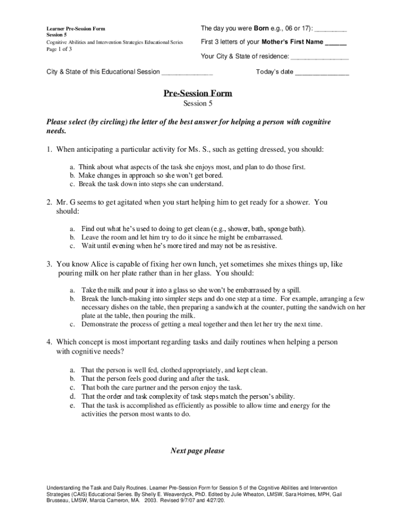 Learner PreSession Form Session 5 Cognitive Abilities and Intervention Strategies Educational Series Page 1 of 3The day you were Born e.g., 06 or 17): First 3 letters of your Mothers First Name Your