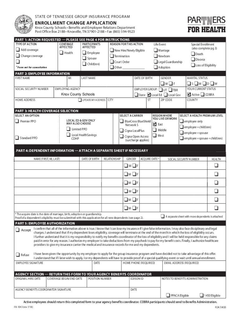 REINSTATE OF TENNESSEE GROUP INSURANCE PROGRAMENROLLMENT CHANGE APPLICATION Knox County Schools Benefits and Employee Relations Department Post Office Box 2188 Knoxville, TN 379012188 Fax (865) 5949523