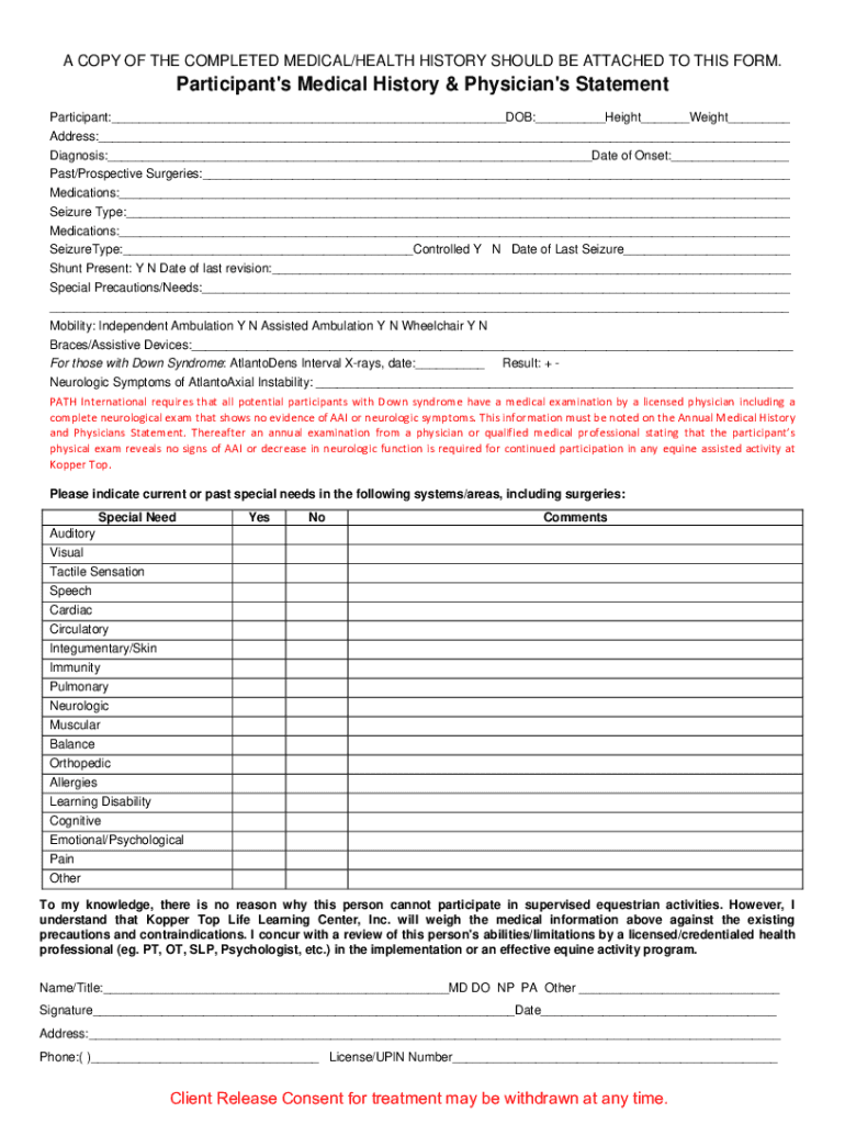 A COPY OF THE COMPLETED MEDICAL/HEALTH HISTORY SHOULD BE ATTACHED TO THIS FORM. Participant's Medical History & Physician's Statement Participant: DOB: Height Weight Address: Diagnosis: Date of Onset:
