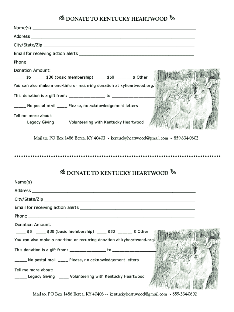 DONATE TO KENTUCKY HEARTWOOD Name(s) Address City/State/Zip Email for receiving action alerts Phone Donation Amount: $$530 (basic membership) $$50 Others can also make a onetime or recurring donation