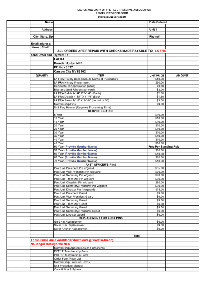 Name of Unit:Phone#ALL ORDERS ARE PREPAID