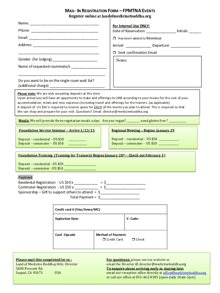 MAIL IN REGISTRATION FORM FPM TNA EVENTS Register online at landofmedicinebuddha.org Name: Phone: For Internal Use ONLY: Date of Reservation: Initials: Email: Has been added to ResnexusAddress: Arrival: