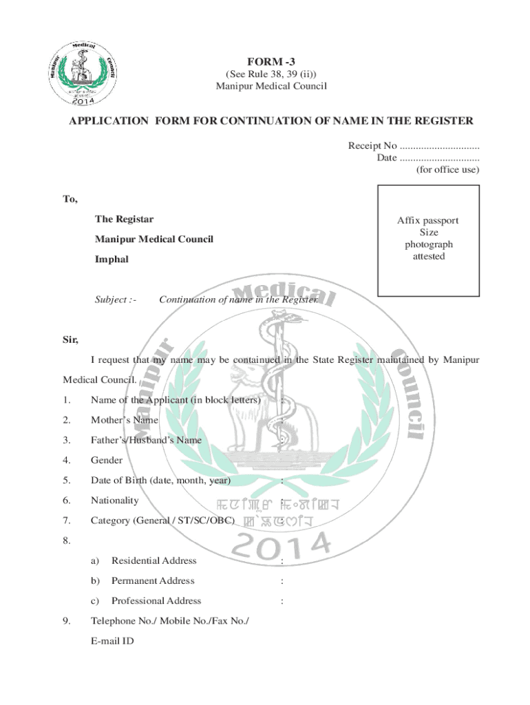 Manipur Medical CouncilAPPLICATION FORM FOR CONTINUATION OF NAME IN THE REGISTER