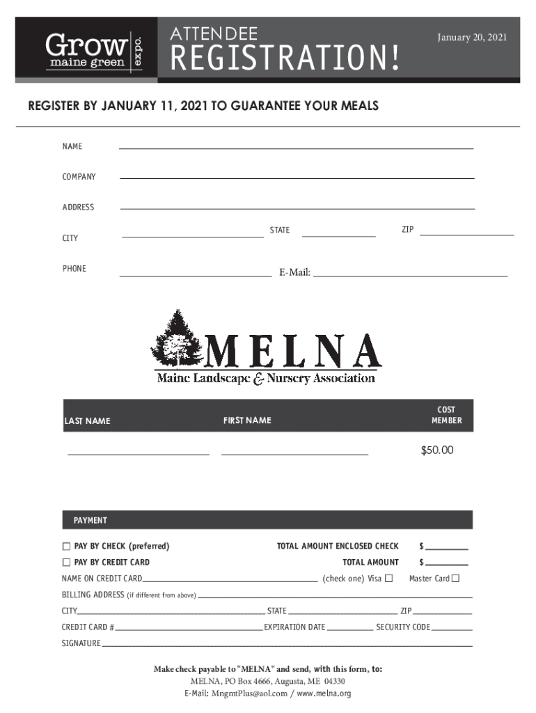 ATTENDEE January 20, 2021REGISTRATION! REGISTER BY JANUARY 11, 2021, TO GUARANTEE YOUR MEALS NAME COMPANY ADDRESS CITY PHONE STATE ZIP Email: COST MEMBERFIRST NAMELESS NAME $50.00 PAYMENT PAY BY CHECK