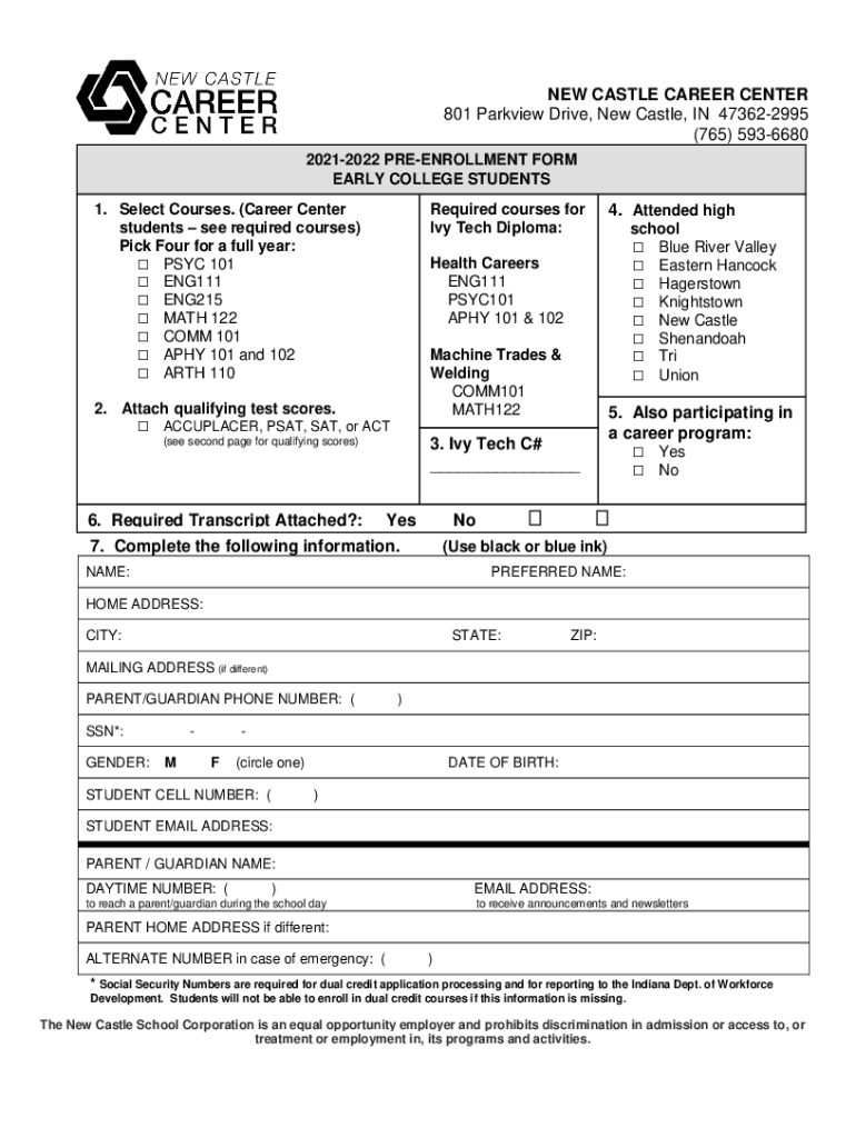 NEW CASTLE CAREER CENTER 801 Park view Drive, New Castle, IN 473622995 (765) 5936680 20212022 ENROLLMENT FORM EARLY COLLEGE STUDENTS 1. Select Courses. (Career Center students see required courses)