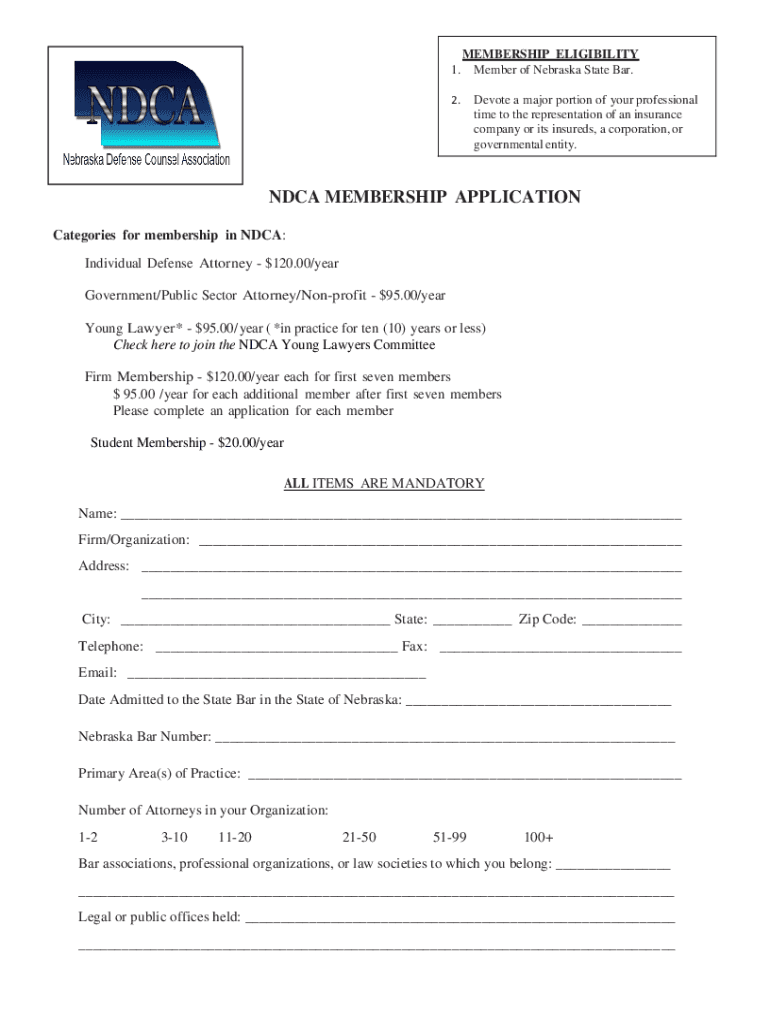 1.MEMBERSHIP ELIGIBILITY Member of Nebraska State Bar.2. Devote a major portion of your professional time to the representation of an insurance company or its insureds, a corporation, or governmental