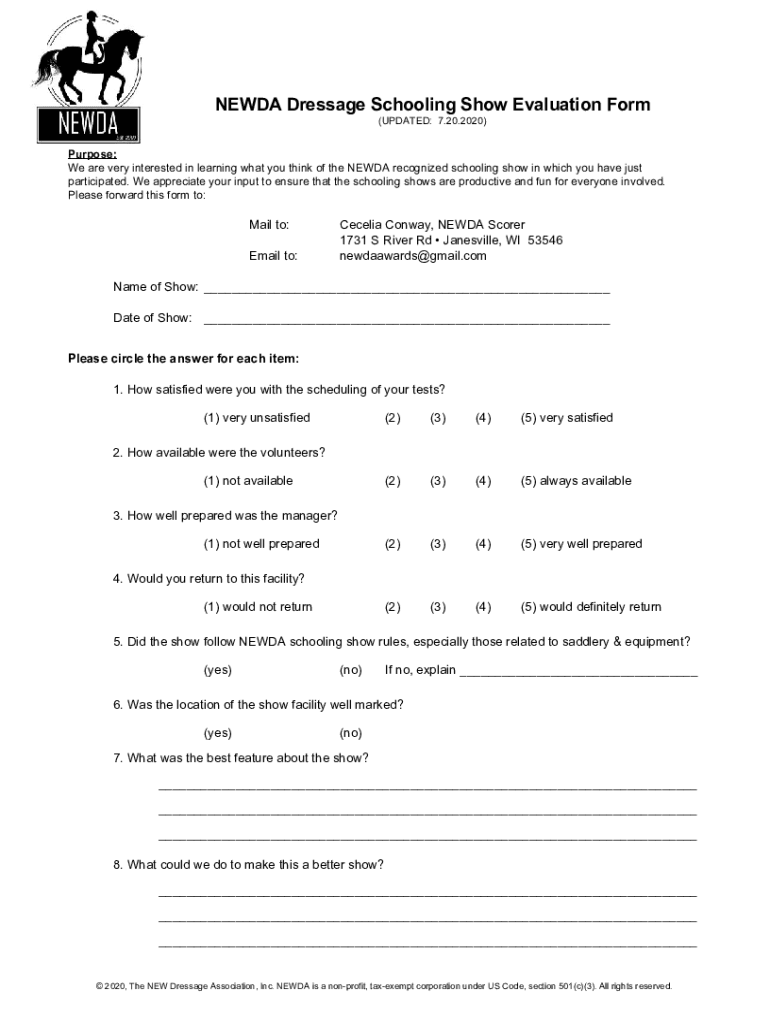NELDA Dressage Schooling Show Evaluation Form (UPDATED: 7.20.2020)Purpose: We are very interested in learning what you think of the NELDA recognized schooling show in which you have just participated.