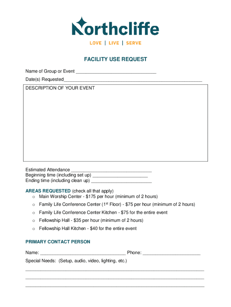 FACILITY USE REQUEST Name of Group or Event Date(s) Requested DESCRIPTION OF YOUR Overestimated Attendance Beginning time (including set up) Ending time (including clean up) AREAS REQUESTED (check