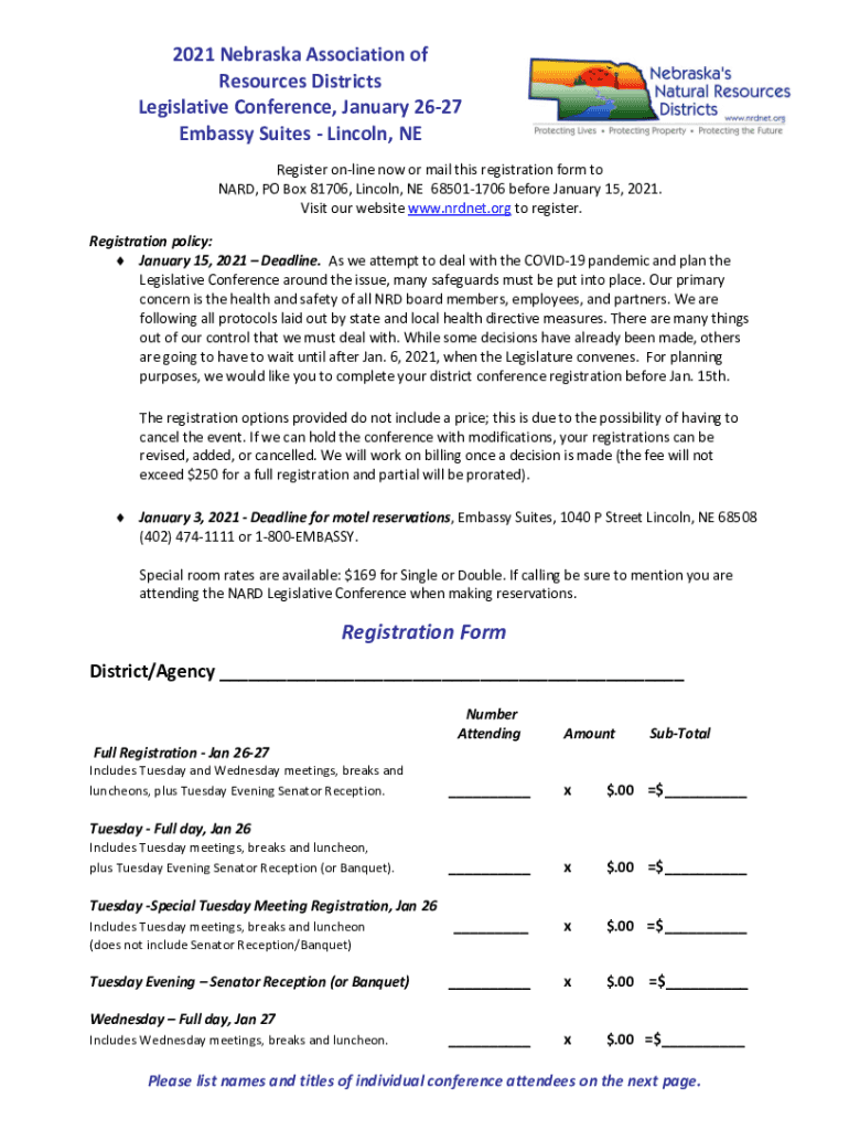 2021 Nebraska Association of Resources Districts Legislative Conference, January 2627 Embassy Suites Lincoln, NE Register online now or mail this registration form to HARD, PO Box 81706, Lincoln,