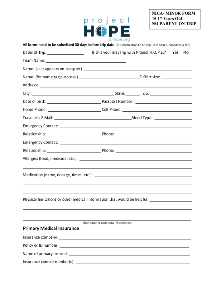 NICE MINOR FORM 1517 Years Old NO PARENT ON Trial forms need to be submitted 30 days before trip date. (All information to be kept in separate, confidential file)Dates of Trip: Is this your first