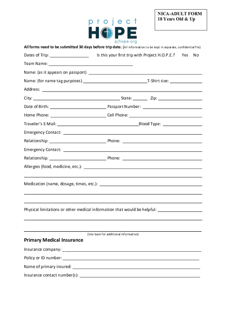 NICAADULT FORM 18 Years Old & Pall forms need to be submitted 30 days before trip date. (All information to be kept in separate, confidential file)Dates of Trip: Is this your first trip with Project