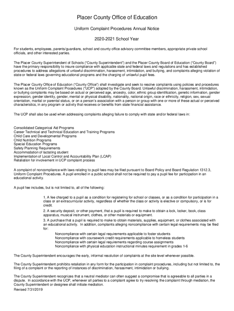 Get the free Sample UCP Annual Notice - Uniform Complaint Procedures ...